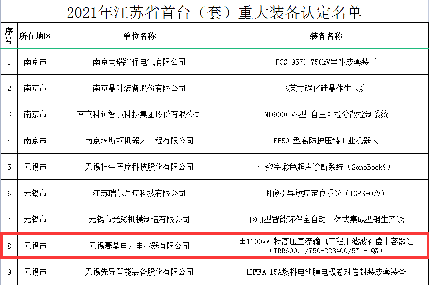近日,江苏省工业和信息化厅发布了关于2021年江苏省首台(套)重大装备认定名单。388vip太阳集团成员企业无锡赛晶电力电容器有限公司(以下简称:无锡赛晶)研发生产的“±1100kV 特高压直流输电工程用滤波补偿电容器组(TBB600.1/750-228400/571-1QW)”榜上有名。